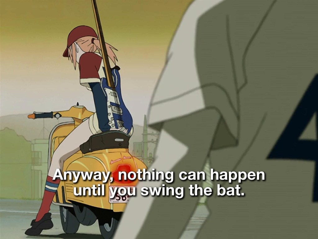This scene from FLCL perfectly describes what I am working on in Jiu jitsu, and really my biggest barrier right now. “Nothing can happen until you swing the bat.” Or in my case: Nothing can happen until you make a move. Decisive action, good or bad, will make or break a fight. Hesitation, reluctance to make a move will beat you more often than attacking recklessly even against a skilled adversary.